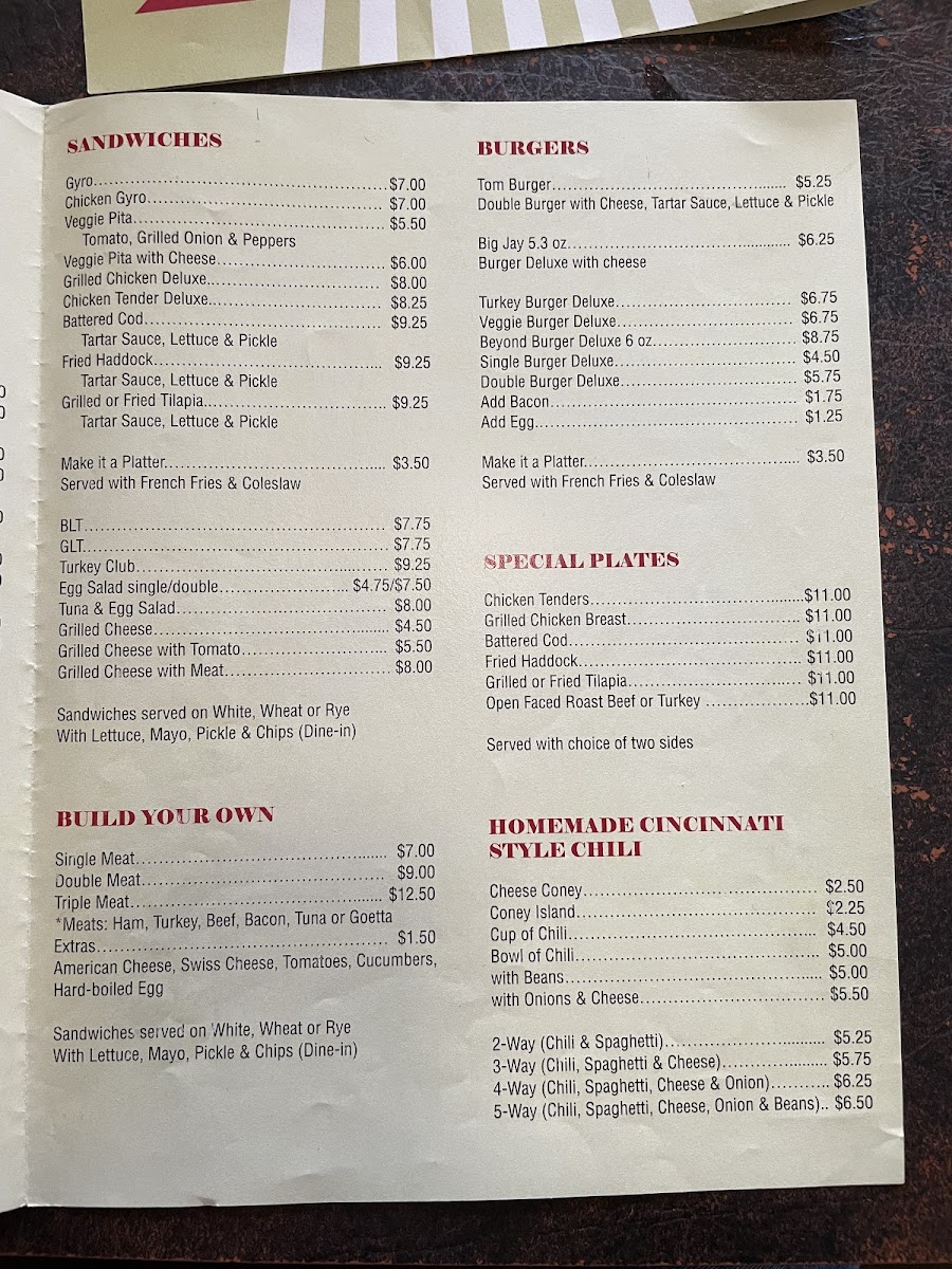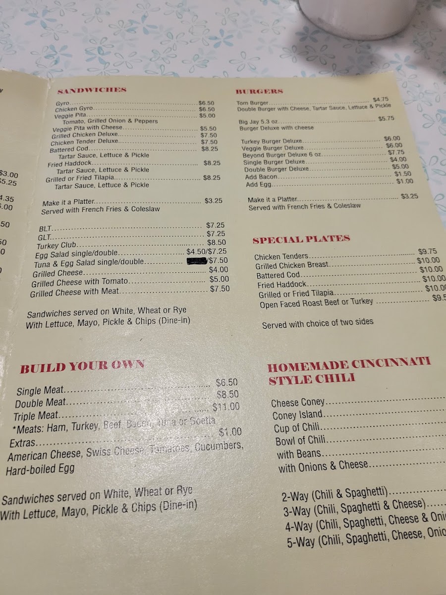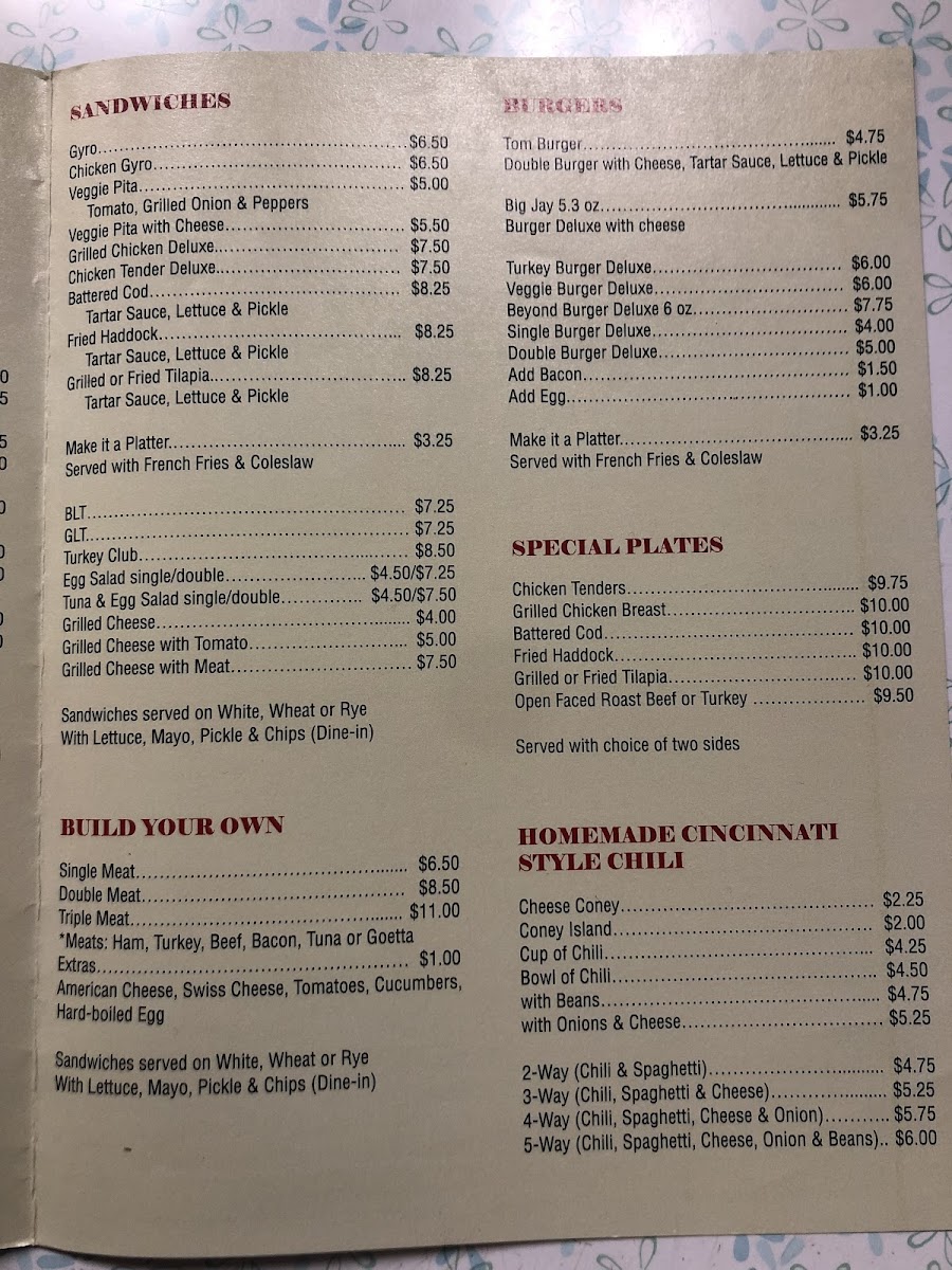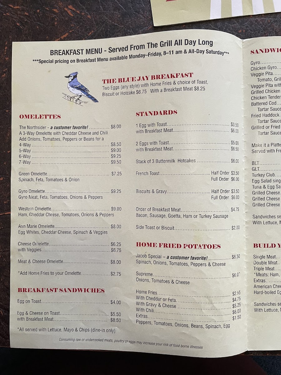 The menu at Blue Jay Restaurant offers a variety of traditional American breakfast and lunch options. Emphasizing hearty comfort food, the selection includes classic breakfast dishes such as omelettes, eggs prepared in several styles, pancakes, French toast, and home fries, often accompanied by bacon or sausage. Notable breakfast items include the Northsider Omelette, Goetta and Eggs, and various omelette options like the Garden and Green Omelette.